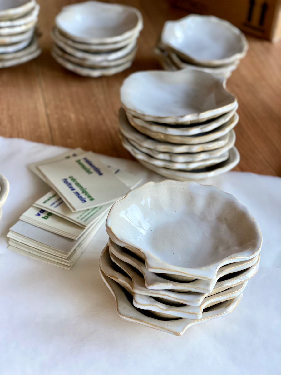 Conception et réalisation d'assiettes wavy et de coupelles organiques en grès pour le chef Merlin Labron-Johnson (Osip*) à Bruton dans le Somerset (UK).